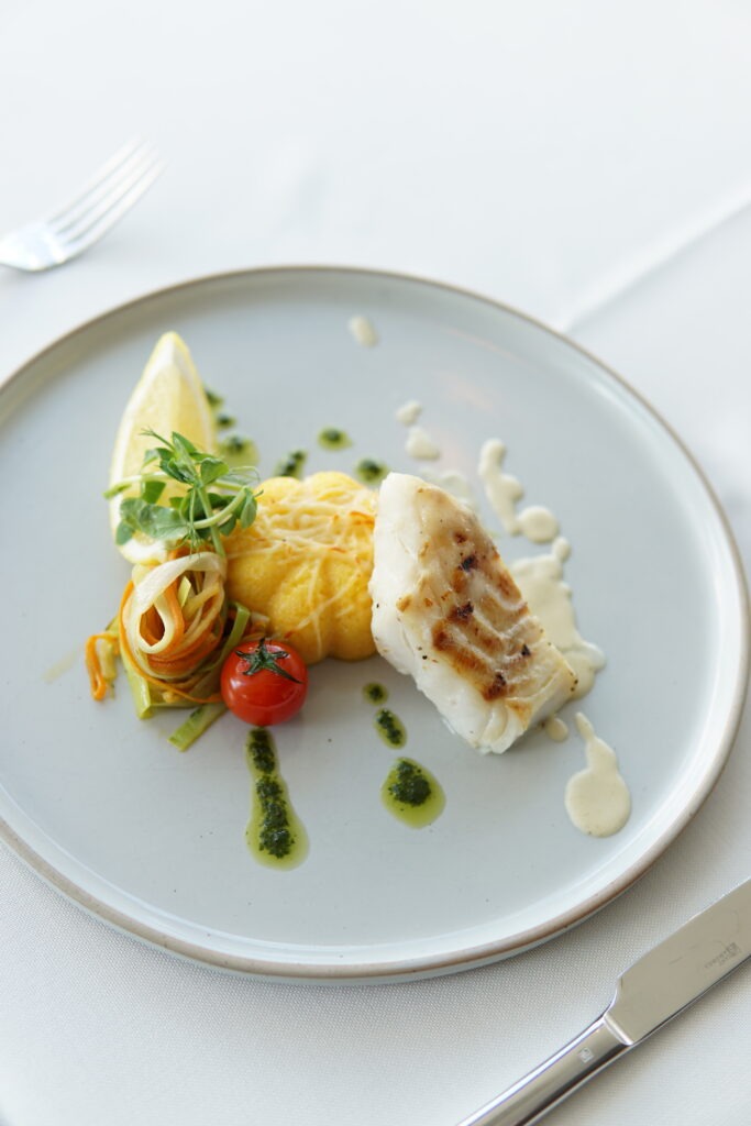 – Cepta mencas fileja sinepju-medus marinādē ar kraukšķīgu polentu, ceptiem sezonas dārzeņiem (kālis, burkāni, ķirbis, puravi) un baltvīna mērci.