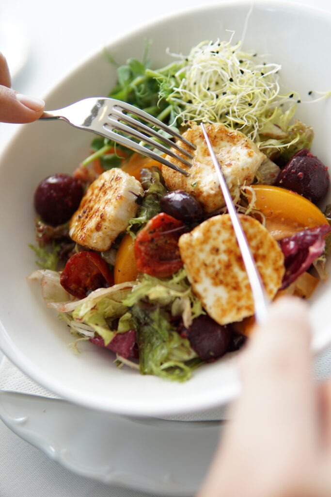 – Zaļie salāti ar ceptām bietēm, karamelizētu kazas sieru, dzelteno tomātu un olīveļļas-cidoniju sulas mērci.
