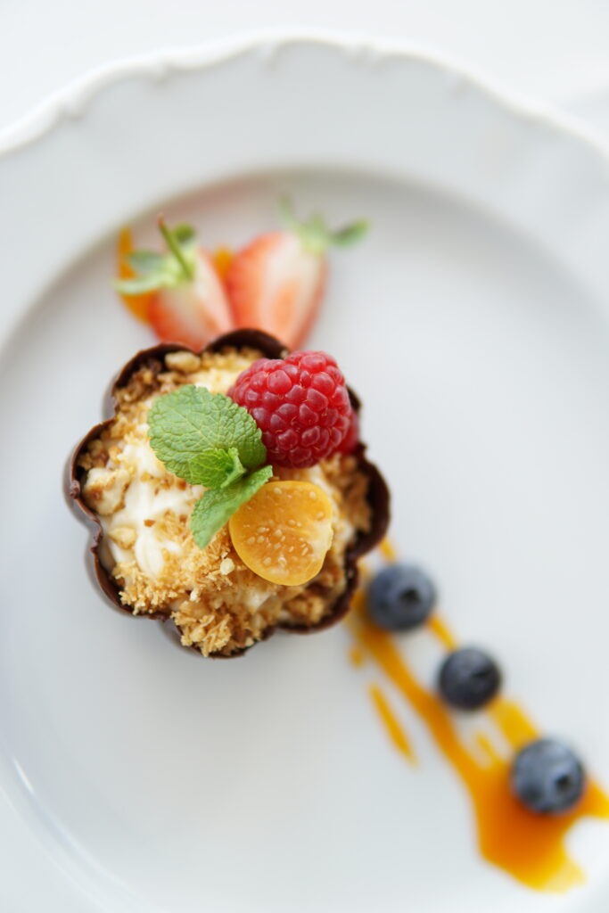 – Šokolādes groziņš ar citronu biezpienu, pārkaisīts ar kataifi drupačām un lazdu riekstiem, pasniegts ar smiltsērkšķu mērci.